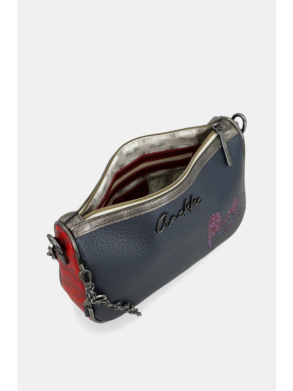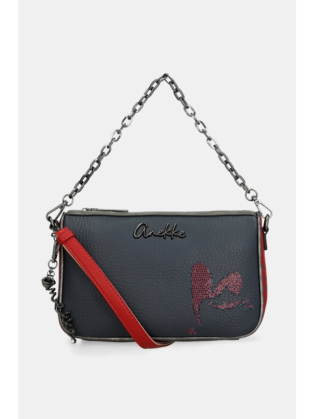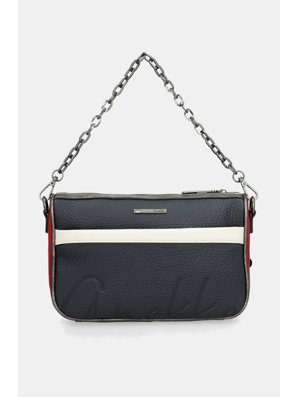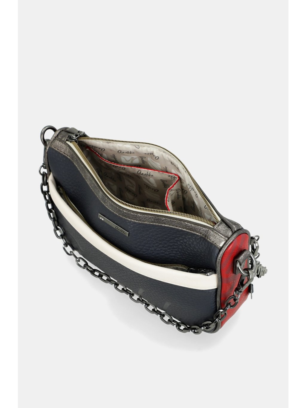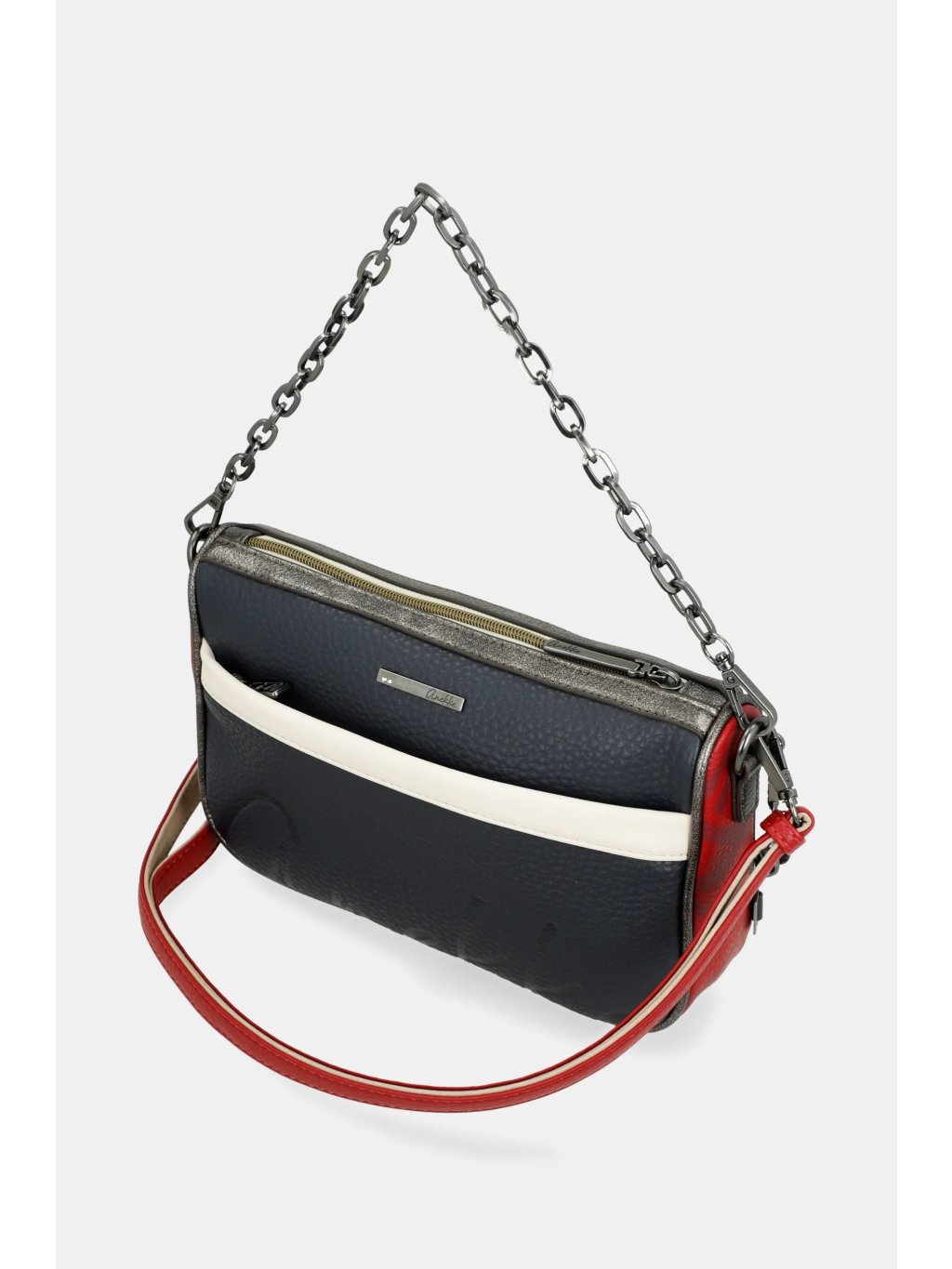 Štýlová a praktická kabelka Anekke Essentials Blue je ideálnym doplnkom pre každodenné nosenie. Elegantná tmavo modrá farba je doplnená jemnými červenými detailmi, ktoré jej dodávajú šmrnc a osobitý charakter. Kabelku je možné pohodlne nosiť cez rameno ako crossbody, alebo vďaka striebornej retiazke elegantne držať v ruke.
