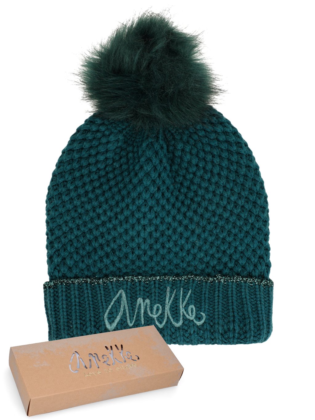Elegantná a hrejivá – tmavo zelená dámska čiapka Anekke s brmbolcom je ideálny doplnok pre zimné dni. Mäkký úplet príjemne objíme hlavu, zatiaľ čo decentný brmbolec dodá čiapku hravý nádych.