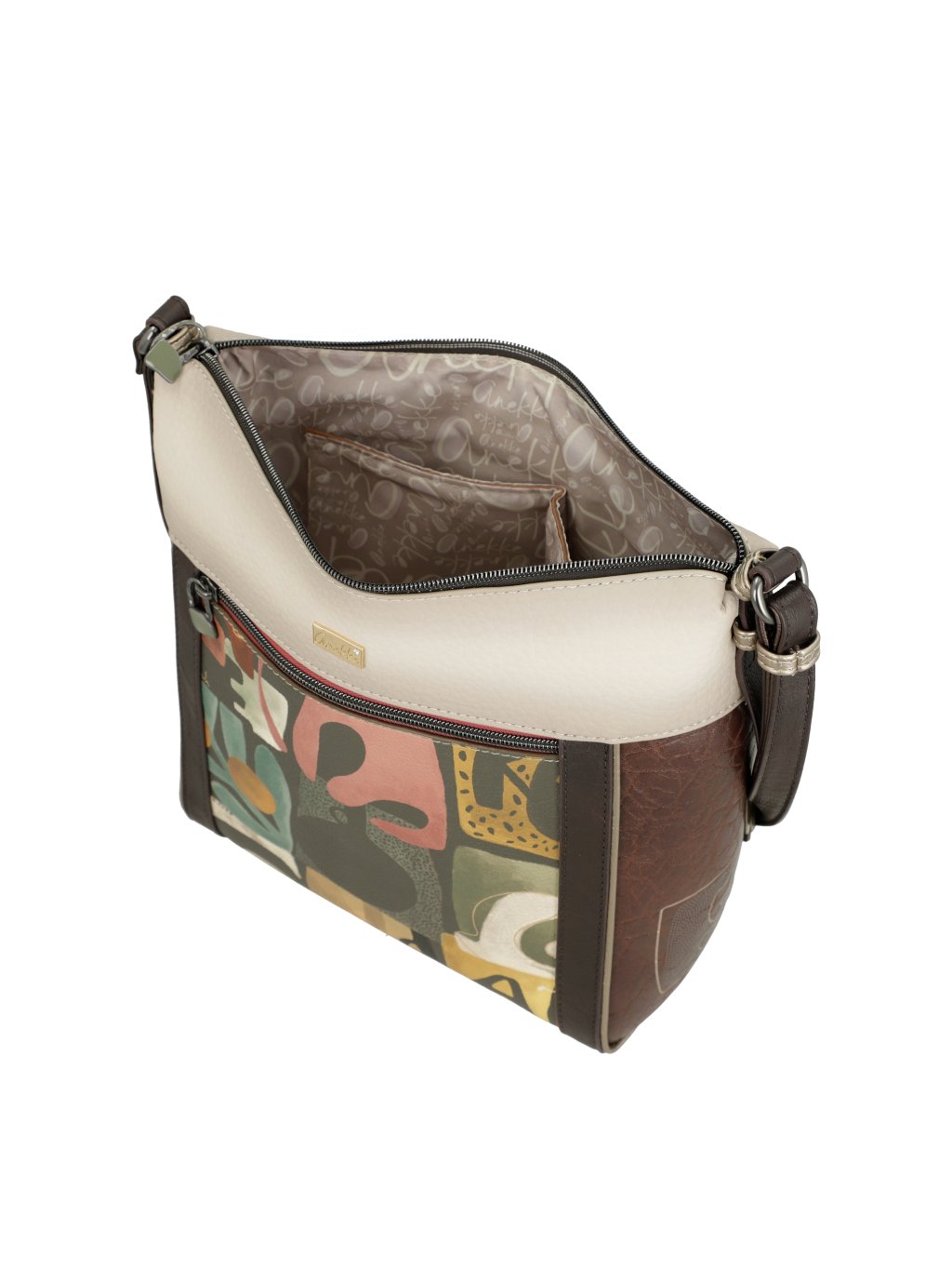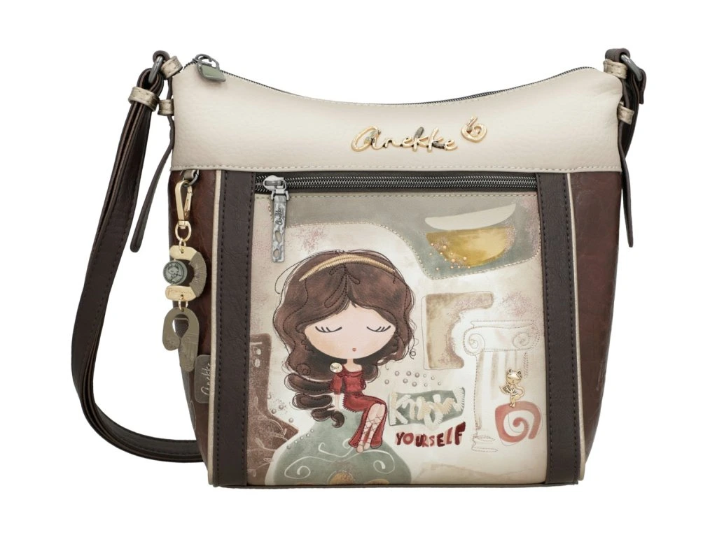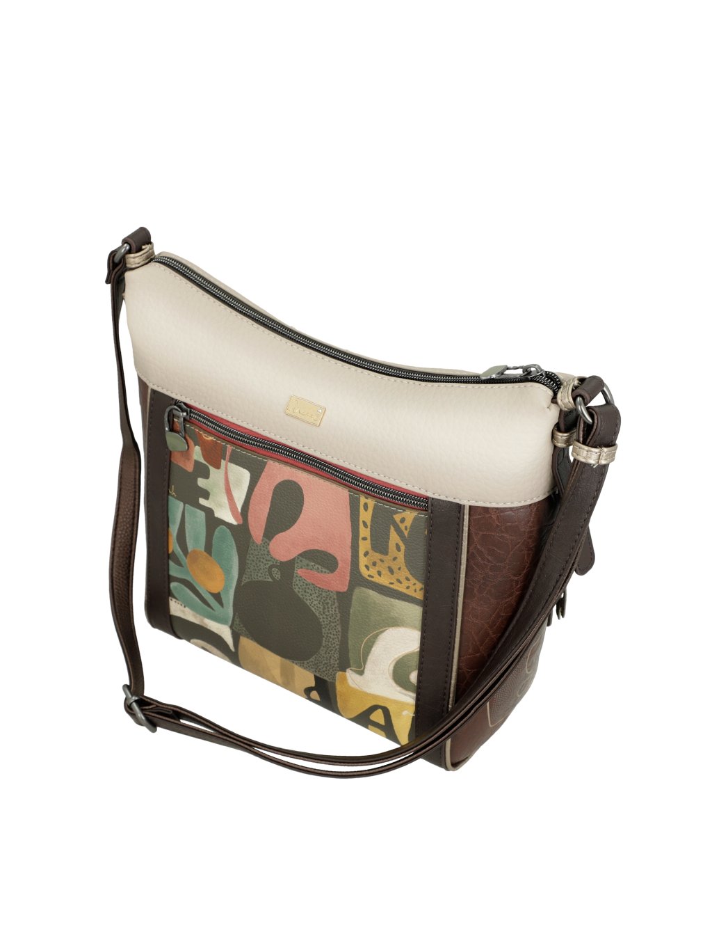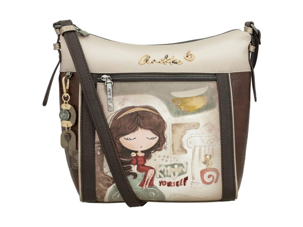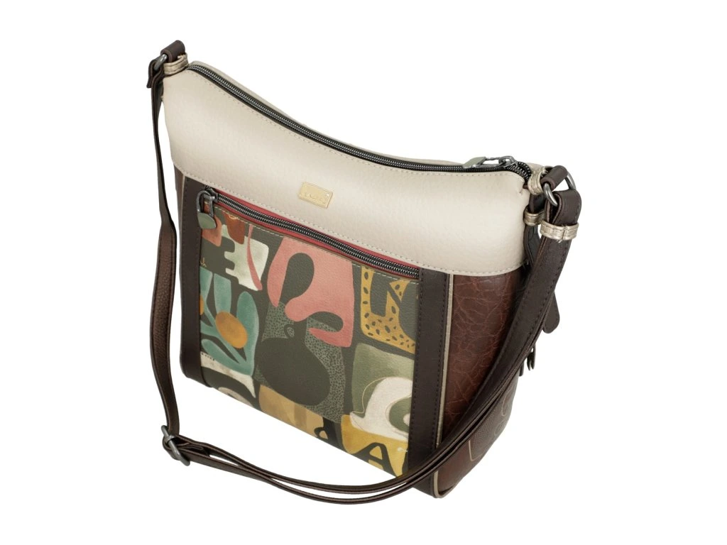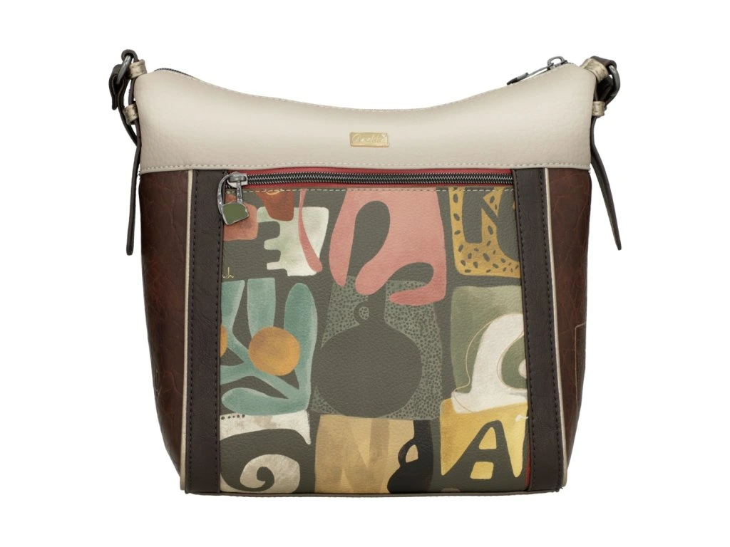 Objavte pohodlie a štýl v jednom s kabelkou Anekke Muse, ktorá kombinuje jemné hnedé a béžové tóny s hravým multifarebným vzorom na zadnej strane. Tento dizajn dáva kabelke osobitý a kreatívny vzhľad, typický pre kolekciu Muse.