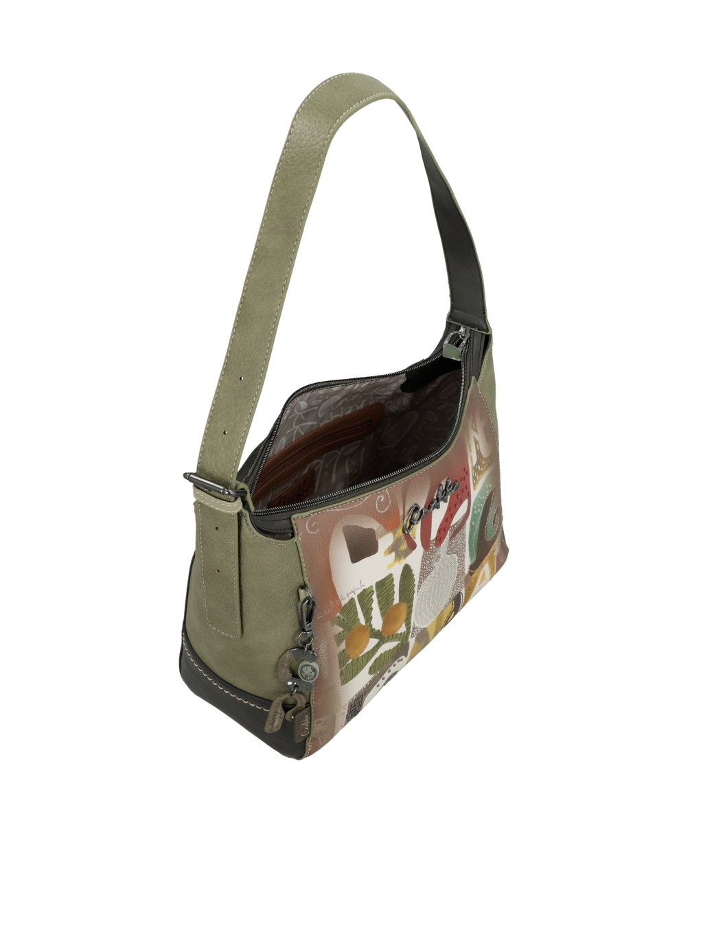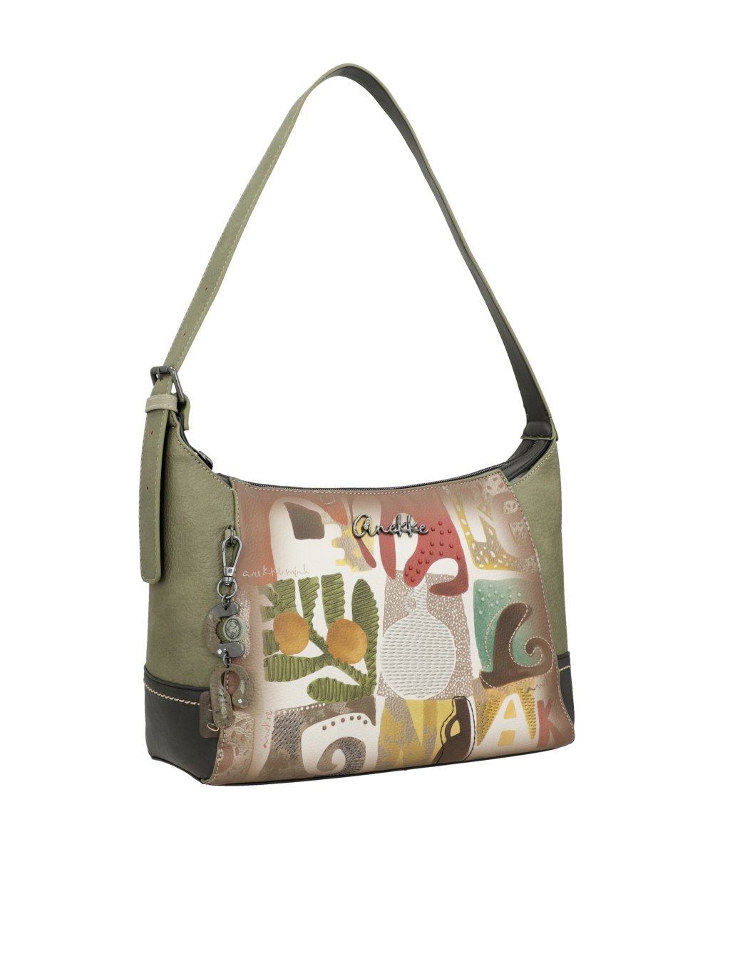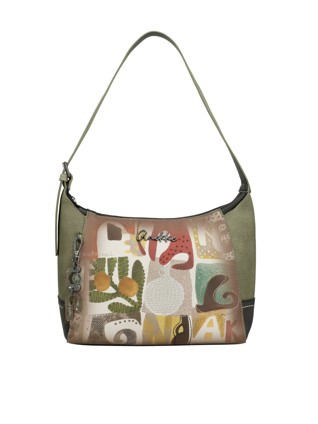 Štýlová, praktická a originálna – taká je kabelka Anekke z kolekcie Amphora. Prednú časť kabelky zdobí jemný multifarebný motív, ktorý jej dodáva hravý a umelecký vzhľad, zatiaľ čo kombinácia zelených a hnedých tónov zaisťuje nadčasovú eleganciu a ľahkú kombinovateľnosť s outfitmi.