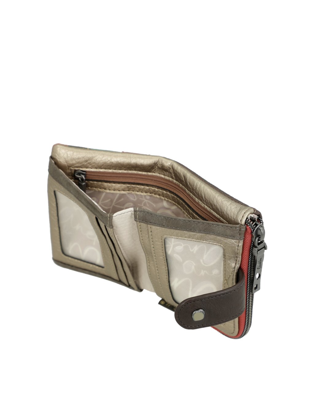 Kompaktná, štýlová a dokonale praktická – malá mäkká peňaženka Anekke z kolekcie Muse je ideálnym doplnkom pre každodenné použitie. Predná časť je ladená do tmavších béžovo-hnedých tónov, ktoré pôsobia elegantne a nadčasovo. Zadná strana potom zaujme originálnym multifarebným motívom typickým pre kolekciu Muse, len nádych.