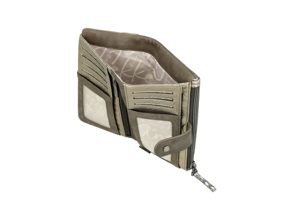 Peňaženka má dva oddiely. Oddiel na mince sa zapína na zips. Oddiel na bankovky a karty sa zapína na jeden z dvoch cvokov (podľa naplnenosti peňaženky). Vnútri tohto oddielu je priestor na bankovky, dve priehradky na doklady alebo papiere, 10 záložiek na karty (2 záložky sú priehľadné) a skryté vrecko na zips. Peňaženku dodávame v originálnej krabičke.