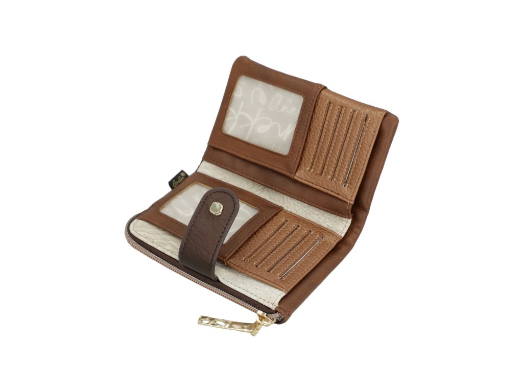 Peňaženka má dva oddiely. Oddiel na mince sa zapína na zips. Oddiel na bankovky a karty sa zapína na cvok. Vnútri tohto oddielu je priestor na bankovky, tri priehradky na doklady alebo papiere, 10 záložiek na karty a skryté vrecko na zips. Peňaženku dodávame v originálnej krabičke.