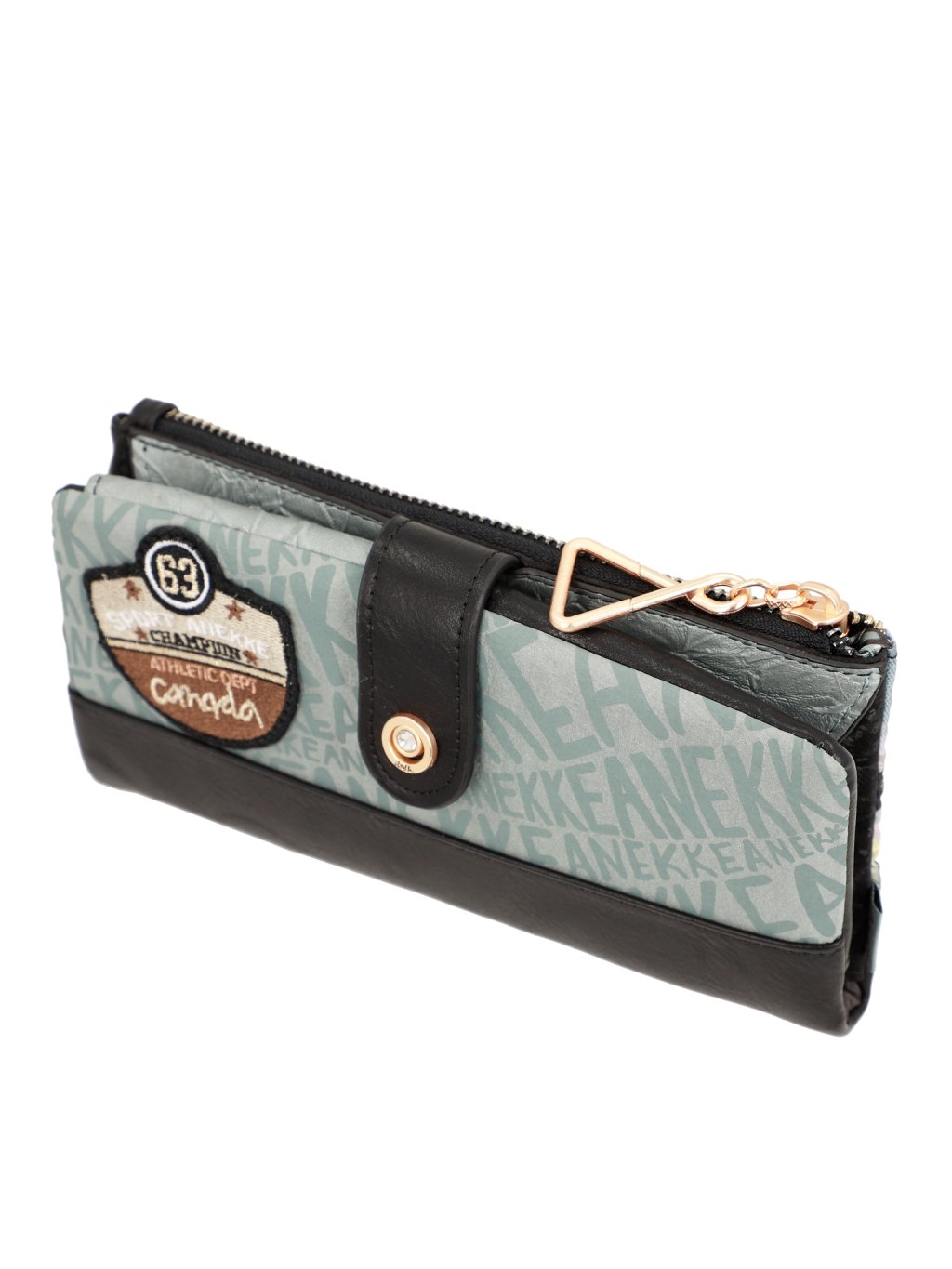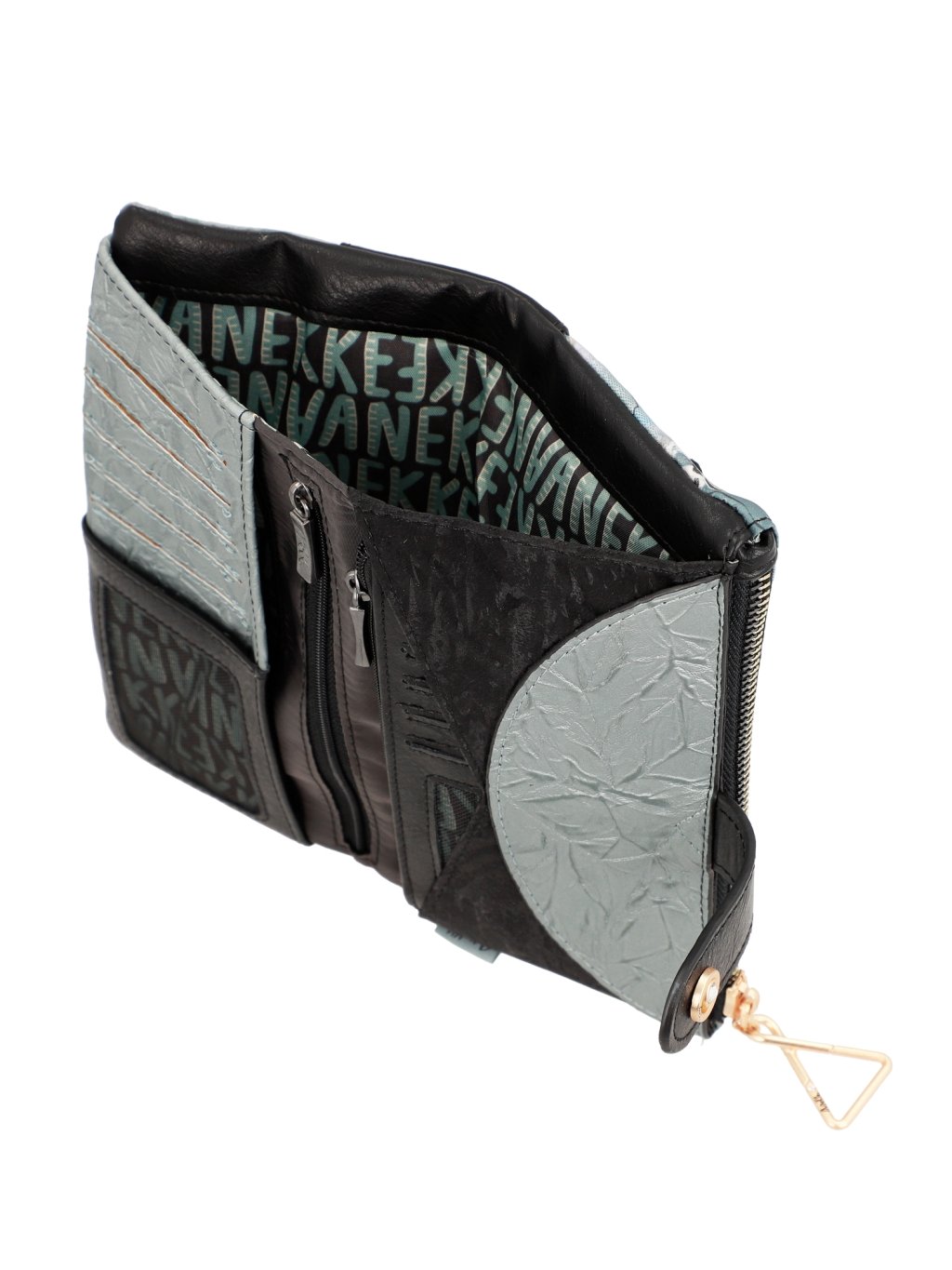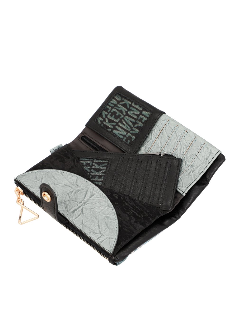 Usporiadanie: 1 samostatná pozdĺžna priehradka na zips, v oddiele na patentku sa nachádzajú 2 pozdĺžne priehradky na bankovky, 1 pozdĺžna priehradka na zips, 5 priehradiek na karty a 1 na fotografie či preukaz. Vložené puzdro zahŕňa pozdĺžnu priehradku na zips, 12 priehradiek na karty a 1 priehľadnú priehradku na doklady. Po vybratí puzdra je priestor vhodný na nosenie mobilného telefónu.